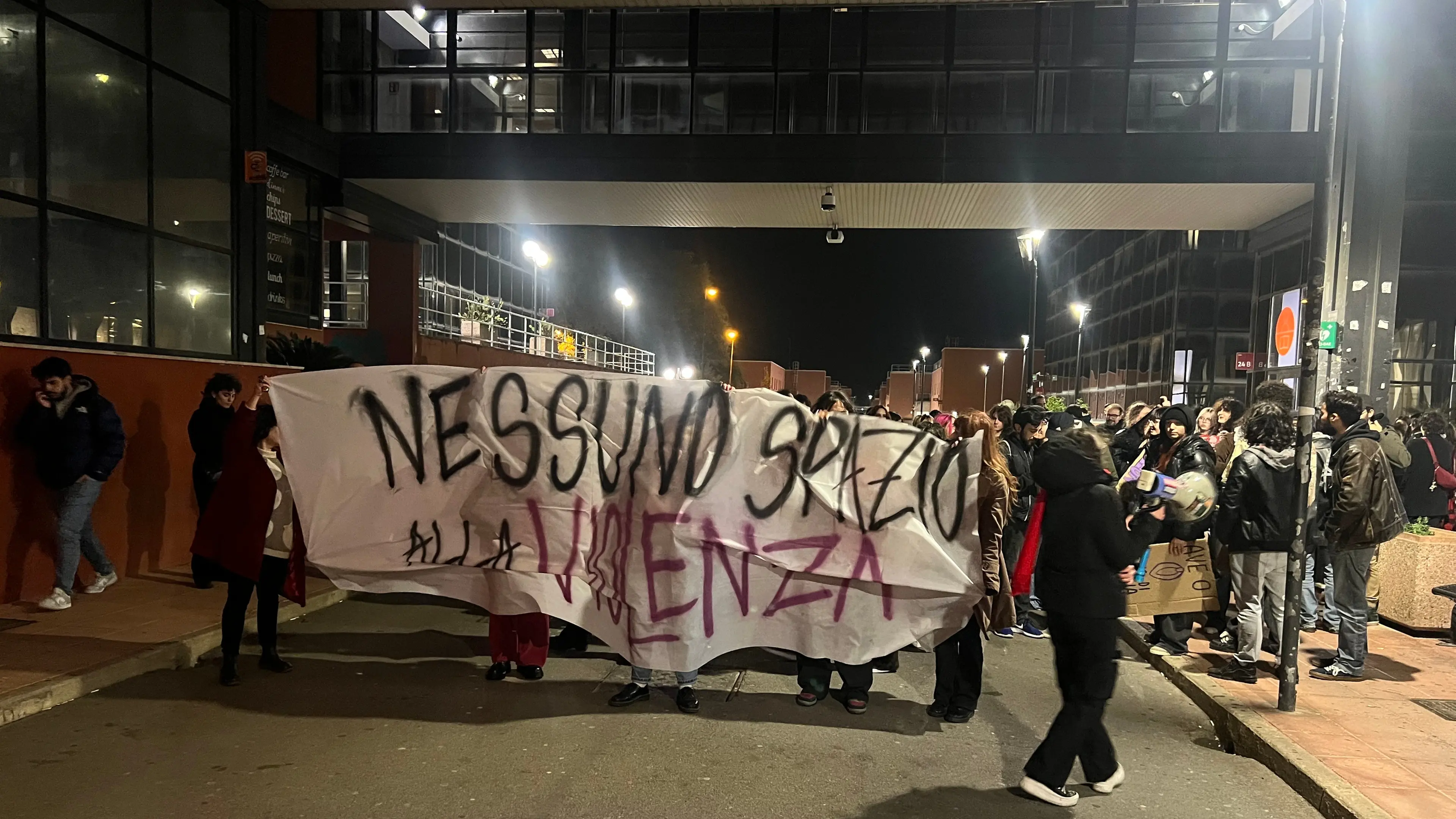 «Nessuno spazio alla violenza». È solo lo striscione che apre il corteo, ma ci sono tanti altri cartelloni. «Non è raptus, è patriarcato», «Se toccano una reagiamo tutte», e poi le contestazioni al governo, «Vogliamo l’educazione sessuo-affettiva nelle scuole», «Governo complice di femminicidio». Si alzano tutti fra i cubi dell’Unical nel corteo organizzato in occasione del 25 novembre, giornata mondiale contro la violenza di genere, al quale hanno partecipato un centinaio di manifestanti. Insieme a loro, anche le rappresentanti del Centro Antiviolenza “Roberta Lanzino”. Un percorso partito dal 25b, sede del Rettorato, arrivato alle pensiline e conclusosi al 18c, nell’aula studio liberata.