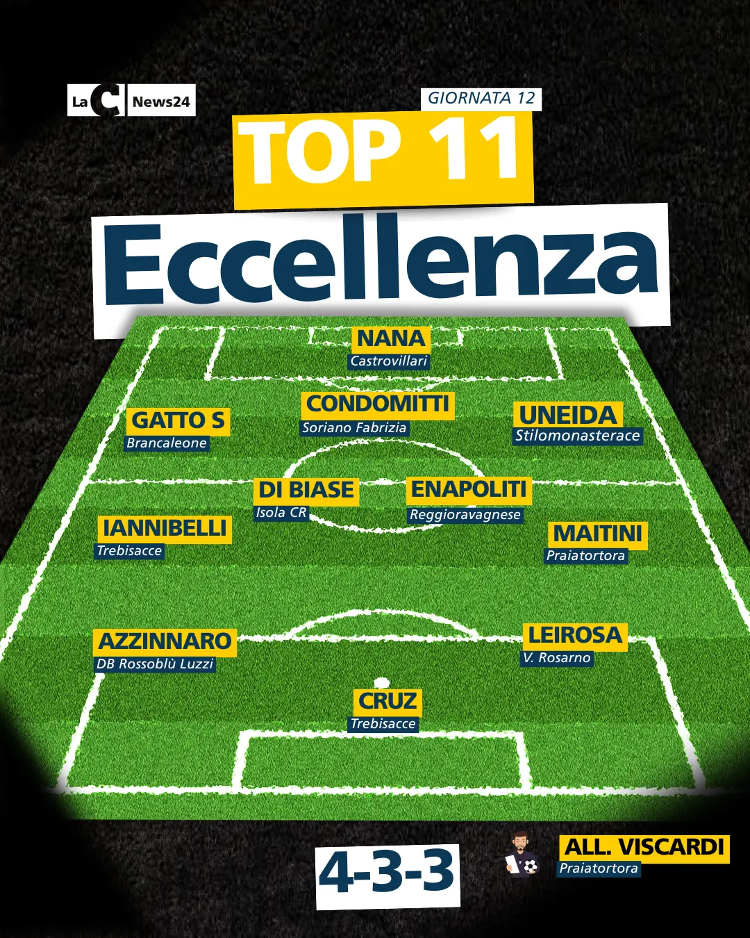Sono venti i gol complessivi messi a segno al termine della dodicesima giornata del campionato di Eccellenza, per una classifica che vede sempre di più il duello in vetta tra Praiatortora e Trebisacce. A prescindere da questo, come di consueto il turno di campionato lascia in dote anche la top 11 stilata ogni lunedì dalla redazione sportiva di LaC News24. L'allenatore della settimana è Salvatore Viscardi, tecnico del Praiatortora che ha saputo gestire la delicata trasferta in casa della Paolana e violando, per la prima volta in stagione, lo stadio Tarsitano.