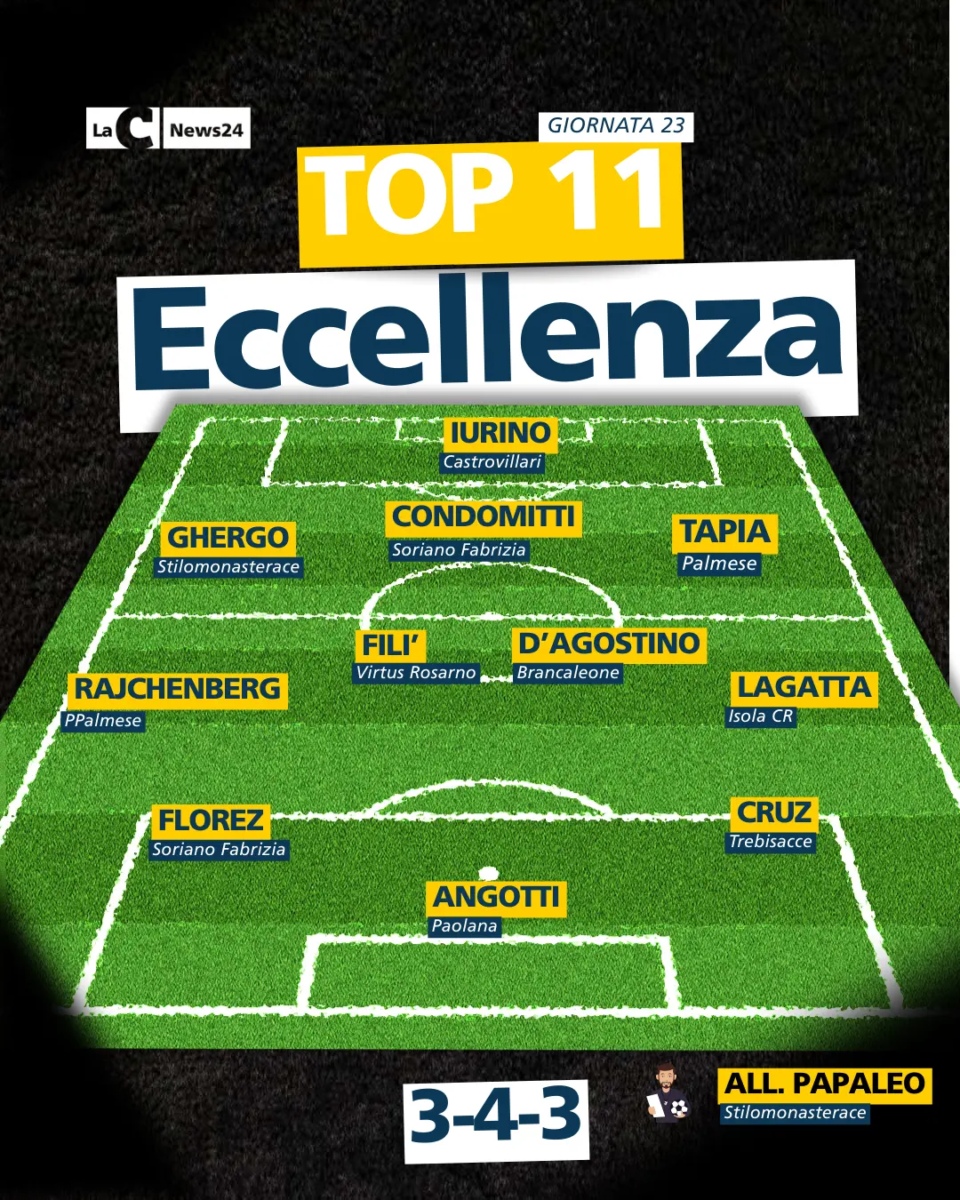 Verso lo sprint finale il campionato di Eccellenza, che nel weekend appena concluso ha archiviato anche la ventitreesima giornata. Tanti i protagonisti catturati, come accade settimanalmente, dalla redazione sportiva di LaC News24 e riproposti nella Top 11 che riassume la giornata. Innanzitutto, l’allenatore della settimana è Giuseppe Papaleo, ormai quasi un cliente fisso: poker dello Stilomonasterace in casa della DBR Luzzi.