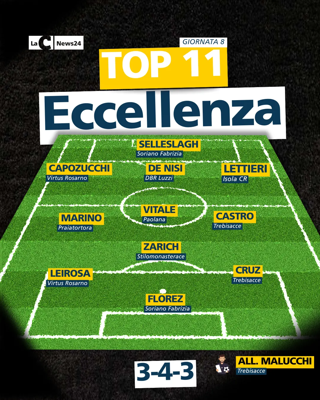 Si è chiusa anche l'ottava giornata del campionato di Eccellenza e, anche stavolta, le sorprese e gli scossoni di classifica non sono mancati. Come ormai di consueto, stilata anche la top 11 settimanale da parte della redazione sportiva di LaC News24 che premia i migliori della giornata.