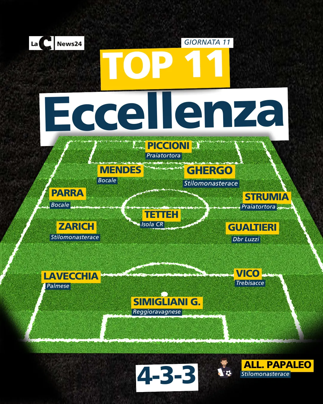 Sono ventiquattro i gol messi a segno nell'undicesima giornata del campionato di Eccellenza e con una soglia play off che si accorcia e desso racchiude diverse squadre. come di consueto, ogni turno del massimo campionato regionale lascia in dote la Top 11 che, puntualmente, viene stilata dalla redazione sportiva di Lac News24. L'allenatore della settimana è Giuseppe Papaleo, grazie anche al dirompente 4-1 rifilato alla Virtus Rosarno.