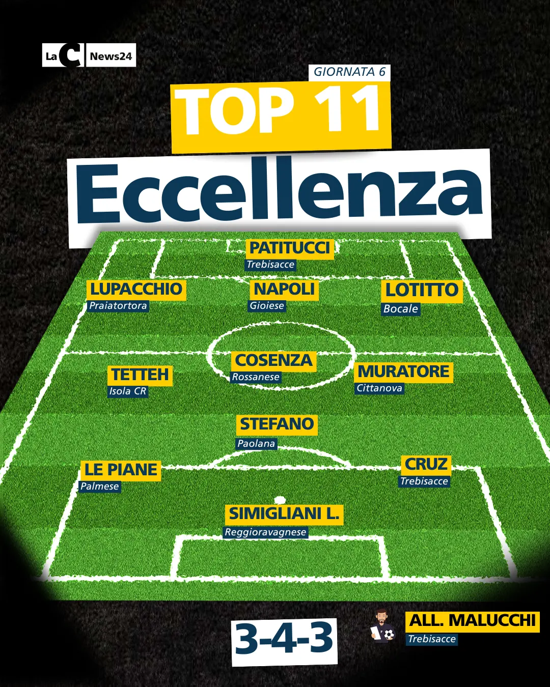 L'archivio della sesta giornata di Eccellenza ha incoronato il Praiatortora come capolista solitaria ma, a due punti di distanza, rimangono col fiato sul collo Paolana e Reggioravagnese. Anche stavolta tanta intensità e sorprese, con diversi protagonisti dai campi. Ecco allora stilata la sesta top 11 stagionale da parte della redazione sportiva di LaC News24, che vede in panchina Serafino Malucchi. Proprio quello del Trebisacce è l'allenatore della settimana dopo aver schiantato a domicilio la Virtus Rosarno, squadra costruita per vincere, con un secco 0-3.