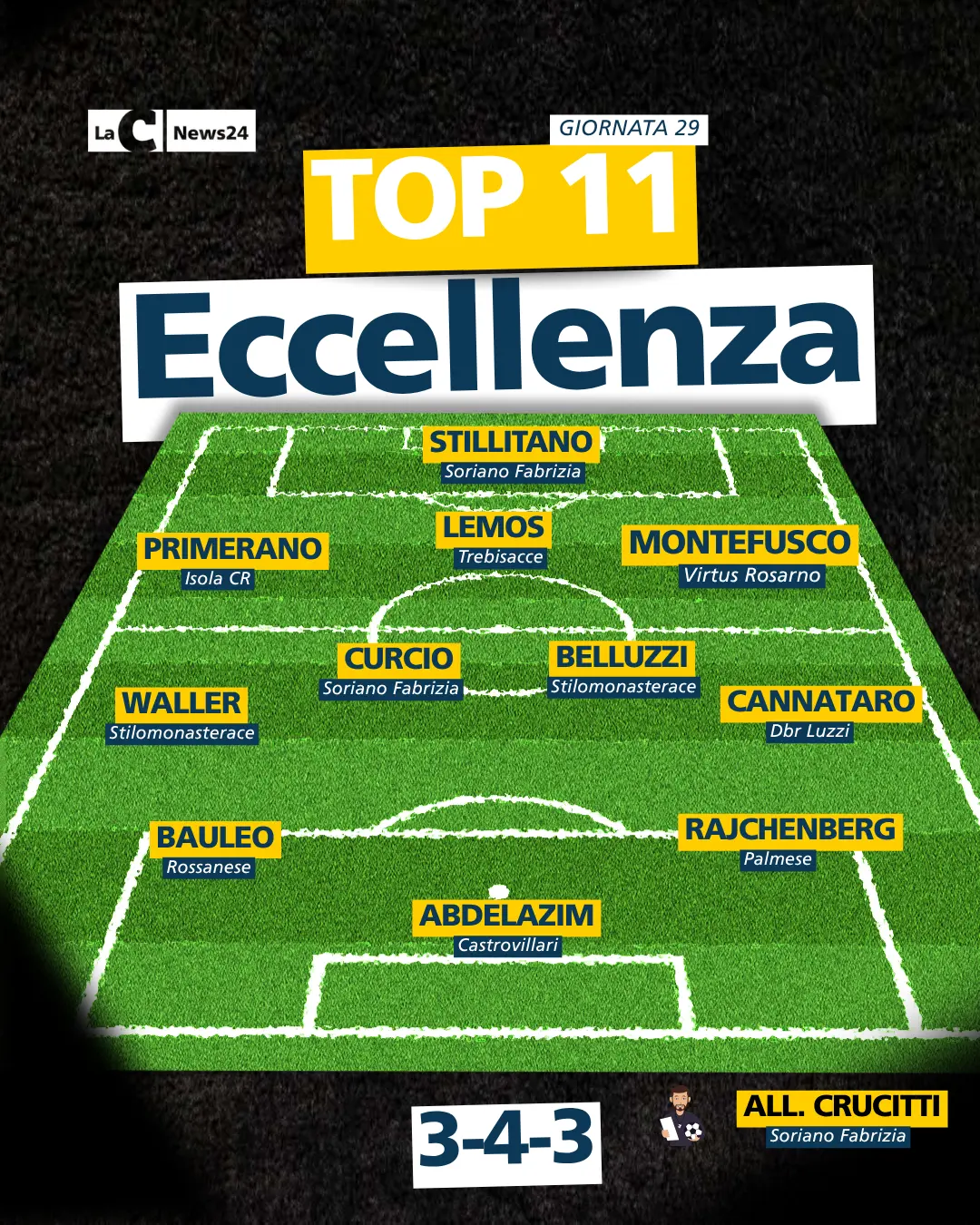 Terminato anche il penultimo turno del campionato di Eccellenza e che ha dato ai posteri ulteriori verdetti. Pioggia di gol (26) innanzitutto e con diversi protagonisti. Ecco allora la penultima top 11 della stagione, stilata dalla redazione sportiva di LaC News24. L'allenatore della settimana non poteva che essere Giuseppe Crucitti. Il tecnico del Soriano Fabrizia va di diritto nella formazione ideale, dopo aver battuto in casa propria i neocampioni del Praiatortora e che erano a punteggio pieno in questo girone di ritorno.