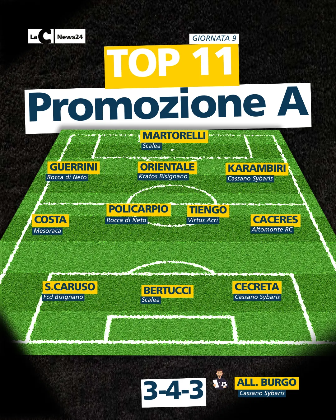 L’attaccante del Cassano Sybaris si guadagna così un posto nella formazione ideale del nono turno. Con lui anche il tecnico Burgo e il difensore Yaya Karambiri. Tra i pali della Top 11 di LaC figura invece Francesco Martorelli dello Scalea, decisivo nel finale della gara vinta di misura contro il Cotronei. A completare la linea difensiva a tre ci sono Guerrini del Rocca di Neto (autore di un assist vincente) e “bomber” Orientale, quest’ultimo autore del gol vittoria del Kratos Bisignano contro il Campora.