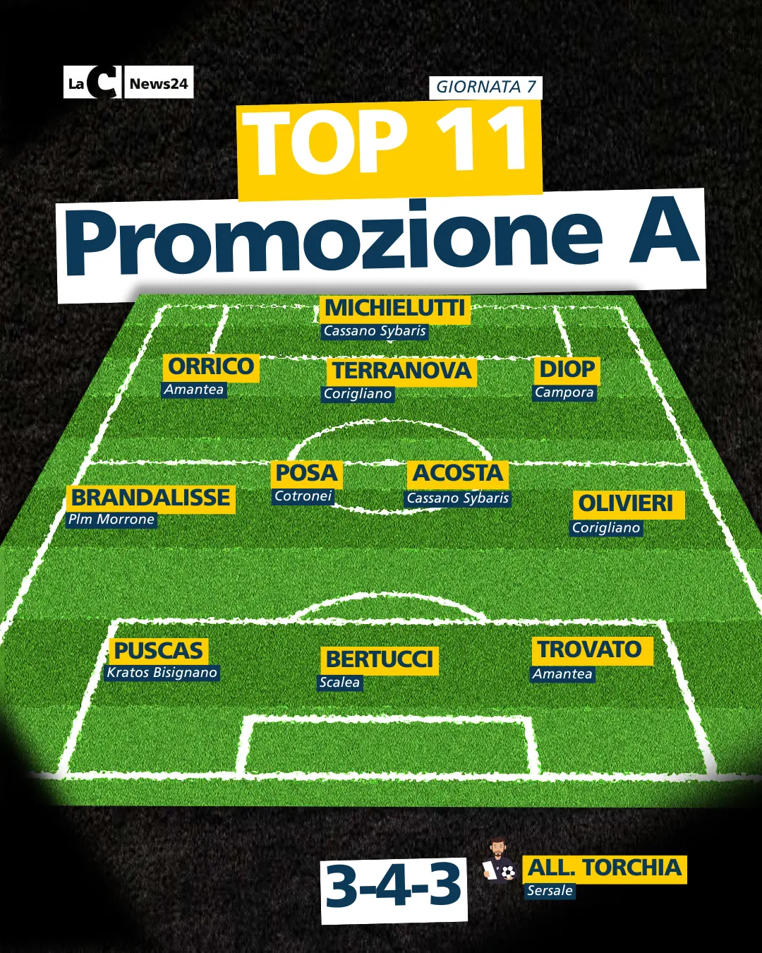 Come di consueto, la nostra redazione ha stilato la formazione ideale della giornata, gli undici giocatori che si sono distinti maggiormente. A guidare la Top 11 di LaC troviamo in panchina il tecnico del Sersale, Torchia: per i catanzaresi sono arrivati 3 punti importanti contro l’Altomonte, una vittoria che porta i giallorossi in vetta alla classifica insieme a Mesoraca e Corigliano.