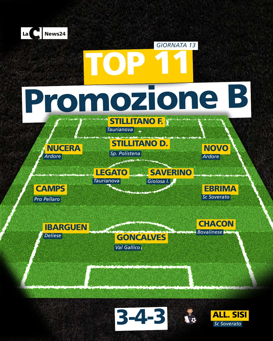 Si è conclusa anche la tredicesima giornata del campionato di Promozione B e che ha visto l'aggancio in vetta alla Deliese di Sc Soverato. In dote l'ultima giornata ha portato in dote anche la consueta top 11, stilata dalla redazione sportiva di LaC News24. Questa volta l'allenatore della settimana è Domenico Sisi: il tecnico del Sc Soverato aggancia la vetta della classifica, mantiene l'imbattibilità stagionale ed è reduce da quattro clean sheets nelle ultime cinque uscite.