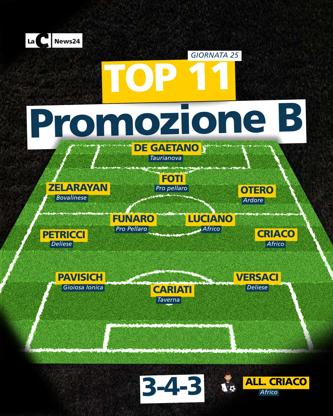 Il reparto di centrocampo è più "contenuto", viste le corsie esterne occupate da Petricci della Deliese e Criaco dell'Africo, entrambi reduci da importanti prestazioni nel week end. Il reparto è completato da Funaro della Pro Pellaro e da Luciano, anch'esso dell'Africo.