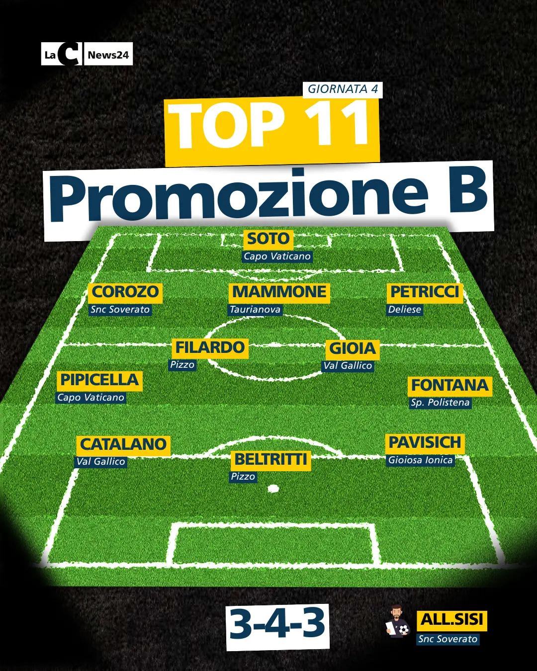 Una Deliese che non molla un centimetro e che corre a punteggio pieno e con una difesa immacolata; un Val Gallico che ha ripreso a correre così come il Gioiosa Ionica e un Snc Soverato che dimostra solidità e ambizione. Tanto è successo nel quarto turno del campionato di Promozione (girone B) tra gol, vittorie e sorprese. Ecco stilata dunque la quarta top 11 stagionale, da parte della redazione sportiva di LaC News. Un virtuale 3-4-3 guidato in panchina da mister Domenico Sisi, e forse una decisione anche attesa visto che ha vinto il big match contro l'Ardore candidata alla vittoria finale.