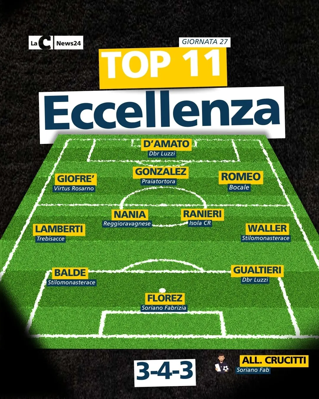 Come al solito, si inizia dall'allenatore della settimana che in questo turno è riconosciuto in Giuseppe Crucitti. Il tecnico del Soriano Fabrizia torna vittorioso da Castrvoillari, si prende il momentaneo quarto posto e adesso culla davvero il sogno playoff.