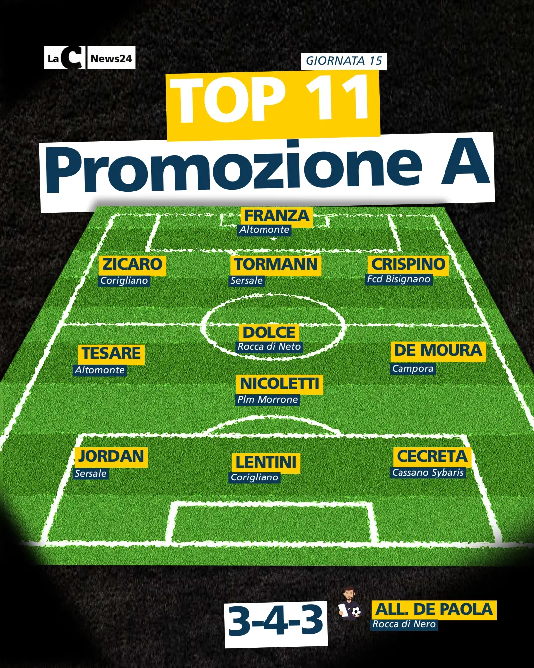 Come di consueto, la redazione sportiva di LaC ha stilato la formazione ideale della giornata, che nel quindicesimo turno vede in panchina il tecnico del Rocca di Neto, Antonio De Paola. La formazione crotonese ha conquistato il derby contro il Mesoraca per 2-0, squadra che naviga nei piani alti della classifica. Il Rocca di Neto manda in Top 11 anche Dolce, autore di uno dei due gol.