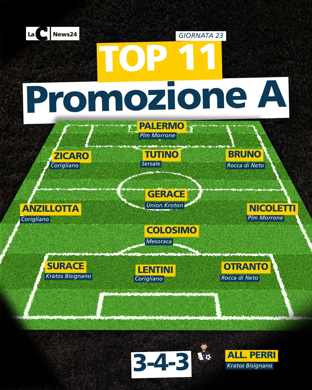 In archivio è andata anche la ventitreesima giornata del campionato di Promozione A, e come di consueto la nostra redazione sportiva ha stilato la formazione ideale del turno. Nell’undici ideale, guidato in panchina dal tecnico del Kratos Carmine Perri, spicca il portiere della Plm Morrone Gianmarco Palermo che si conferma tra i migliori estremi difensori del campionato, parando un rigore nel 3-0 dei suoi sul Cotronei.